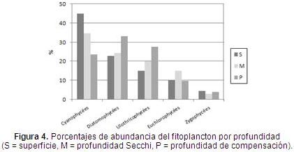 En porcentaje, las Cianophycées al igual que las Diatomophycées fueron siempre las más abundantes en las tres profundidades consideradas (Figura 3). Su dominancia es independiente de la profundidad debido a que están perfectamente adaptadas a vivir en toda la columna de agua. Las grandes ornamentaciones, las largas proyecciones celulares y la tendencia a formar cadenas de células permiten a las Cianophycées y a las Diatomophycées permanecer en las capas superficiales. Las Cianophycées y las Diatomophycées presentaron sus mayores porcentajes de abundancia en el muestreo de octubre de 2006 (30,4% y 17,3% en superficie y 15,4% y 29,5% en la profundidad Secchi, respectivamente). Según Humm y Wicks (1988) y Reynolds (2006) las cianofíceas prosperan mejor en las capas superficiales que en las profundas, sin embargo, en las aguas de la laguna Aguas Tibias se encontraron representadas en todas las profundidades, en las cuales hay buena disponibilidad de luz.