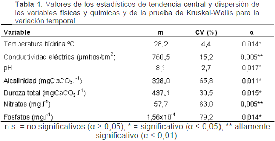 Los análisis estadísticos (ANOVA, Tuckey, Duncan, Krustall-Wallis), para los datos fisicoquímicos, permitieron establecer que las variaciones detectadas no son significativas (0,19 < p < 0,97), tanto en espacio como en tiempo, concluyendo una gran estabilidad en los parámetros físicos y químicos biológicos.