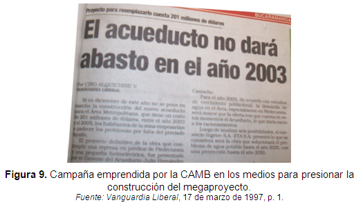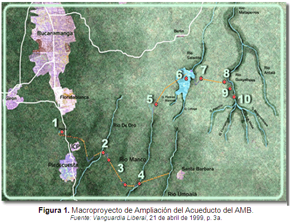 Hacia 1993 se informó por parte del gerente de la CAMB que las instalaciones del acueducto metropolitano tendrían una vida útil hasta el 2010 y se hacía necesario planear una serie de embalses para suplir la demanda de agua potable a partir de este año, y a la vez generar energía (Vanguardia Liberal, 5 de febrero de 1993, p. 3b). Sin embargo, durante una nueva gerencia en la CAMB hacia 1997 se divulgó reiteradamente por los medios de comunicación que si no se ejecutaba la ampliación del acueducto, la ciudad se vería avocada a racionamientos de agua hacia el año 2003.