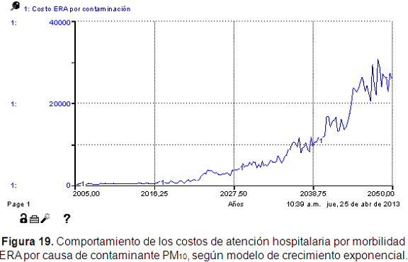 Los modelos de simulación analizados permitieron mostrar la relación encontrada entre el crecimiento del parque automotor de la ciudad y la morbilidad por ERA. Cuando se relacionó la emisión contaminante con PM10, el modelo evidenció dos comportamientos que deben ser considerados. El primero de ellos es la relación entre morbilidad y emisión, y el segundo la relación entre morbilidad y concentración. Ambas relaciones deben ser estudiadas con mayor detalle para obtener resultados más cercanos a la realidad (Figura 11).