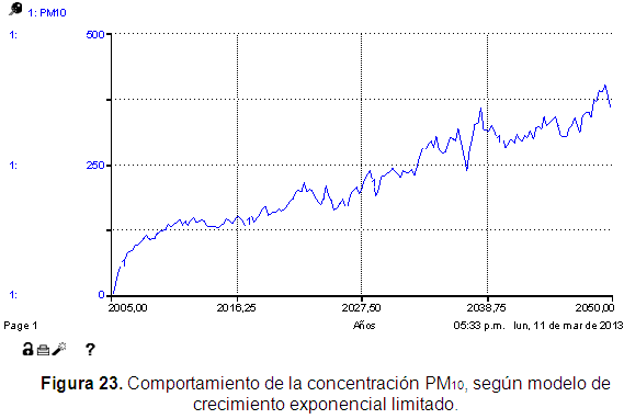 El modelo con crecimiento limitado corroboró lo evidenciado en el modelo de crecimiento exponencial, mostrando que a medida que se emiten contaminantes (PM10), la concentración de estas sustancias en el ambiente de la ciudad seguirá creciendo hasta valores críticos que comprometen la salud de la población de Pereira, superiores a 160 ug/m³ (Figura 23).