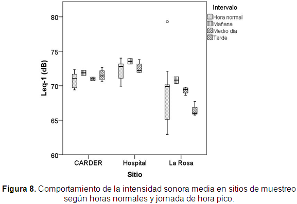 En general se encontró que el comportamiento del flujo vehicular como era de esperarse es significativamente superior (p<0,05) en horas pico que en horas normales, al considerar como horas pico tres periodos de tiempo comprendidos entre las horas de la mañana (7:30a.m. a 8:00a.m.), horas del mediodía (11:30a.m. a 1:00p.m.) y horas de la tarde (5:00p.m. a 7:00p.m.) (Figura 5).