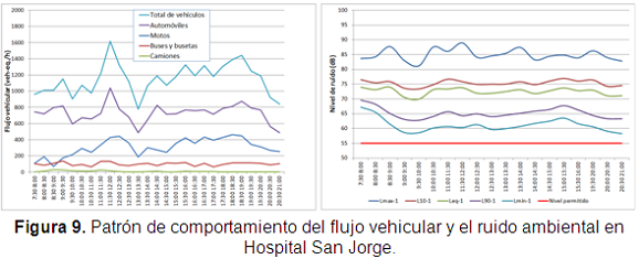 Con respecto al ruido la tendencia general fue similar al comportamiento del flujo vehicular, siendo más evidente en los sitios de muestreo de las estaciones de monitoreo de calidad de aire ubicadas en CARDER y el Hospital San Jorge (Figura 6). La hora pico de la tarde es la que presentó el mayor flujo vehicular (Figura 7), mostrando una correspondencia esperada con los niveles de presión sonora tomados en los sitios estudiados (Figura 8).