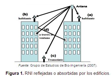 Por otra parte, se ha considerado que un individuo que habita en un edificio, el cual posee la EBTM, recibe menos radiación que el individuo del edificio vecino que está expuesto frontalmente y a menor distancia. Sin embargo, el habitante del edificio que porta la estación base puede estar irradiado por las reflexiones de las radiaciones electromagnéticas, esto solo si existe alguna estructura en el edificio vecino que refleje dichas ondas (ver Figura 1) (Grupo de Estudios de Bio-Ingeniería, 2007). Sin embargo, es importante que se evalúe si las personas que habitan en el último piso del edificio que porta la EBTM se pueden ver afectadas por lóbulos secundarios de las antenas ubicadas allí.