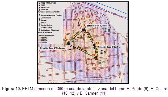 Zonificación de las áreas con alta exposición a las radiaciones electromagnéticas emitidas por las EBTMPara zonificar las áreas con alta exposición a radiaciones electromagnéticas emitidas por las EBTM, se requiere de un mapa base del municipio, un software para el manejo de sistemas de información geográfica (v.g. ArcGis 9.3) y los puntos georreferenciados (EBTM y sitios vulnerables). Las distancias entre las EBTM cercanas y las distancias entre los sitios identificados como vulnerables y las estaciones base son determinadas a partir del sistema de información geográfica, junto con las áreas de mayor vulnerabilidad que tienen un radio de 100, 200 y 300 m respecto a la estación base. Estas áreas, a su vez, permiten identificar zonas de superposición de los CEM de las EBTM, que se encuentran a menos de 300 m una de la otra.