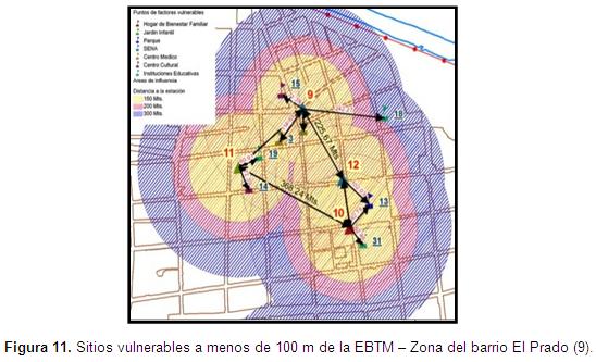 Factor vulnerableEl primer criterio valora la presencia y las características de los sitios vulnerables, instituciones educativas, jardines infantiles, guarderías, hogares de bienestar familiar, centros de salud, hospitales, hogares geriátricos y centros penitenciarios, en las áreas de influencia de las EBTM que se encuentran en un radio de 100, 200 y 300 m con respecto a estas.
