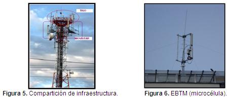 También, es importante conocer el número de antenas en cada EBTM, debido a que la cantidad y el tipo de antenas que se dispongan dependen de las características del espacio de cobertura y de la potencia a irradiar que desea el operador; en otras palabras, el número de antenas en una EBTM depende de varios factores, como: el tipo de célula, si hay compartición de infraestructura (ver Figura 5), y las características topográficas y urbanísticas del área de cobertura. Por lo anterior, si se desea dar cubrimiento a una celda o célula de gran área, se emplean antenas con ángulos horizontales más cerrados, dado que el alcance de la antena es mayor. Además, si el área de cubrimiento tiene un mayor número de edificios y de tráfico de llamadas (v.g. el centro de las ciudades), se reduce el área de las celdas de cobertura de las EBTM y se aumenta el número de estaciones en el sector, para poder garantizar niveles óptimos de señal a los usuarios, lo que genera más emisiones, y por ende, una mayor exposición del público (Federación Española de Municipios y Provincias, 2008; Gallego, 2011).