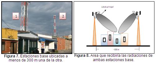 El cuarto criterio evalúa la existencia de estaciones base localizadas a una distancia menor de 300 m una de la otra; considerándose que si existen estaciones base cercanas, se genera un área en que se superponen las radiaciones de ambas EBTM, aumentado así el nivel de exposición de la población en determinada zona (ver Figuras 7 y 8); además, valora aquellas situaciones donde se presenta compartición de infraestructura, dado que en estos casos también se generan áreas de superposición de los CEM, debido a que las antenas de los operadores que comparten la infraestructura pueden estar emitiendo sus lóbulos principales en la misma dirección; no obstante, esta situación se hace más crítica en la medida en que las áreas de superposición de los CEM se presentan en las zonas más cerca de las EBTM, donde la densidad de potencia es mayor.