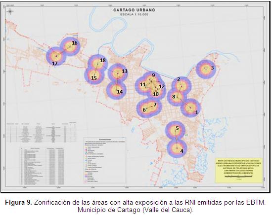 La validación de la metodología para el diagnóstico de las áreas urbanas con alta exposición a radiaciones electromagnéticas emitidas por EBTM, se efectuó en el municipio de Cartago (Valle del Cauca), que por ser un área pequeña (con 1.394,304 ha en la zona urbana) y con densidad baja de EBTM, permitió validar esta en un tiempo moderado y someter a prueba el método.
