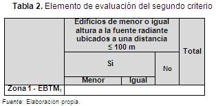 El segundo criterio se define con el fin de conocer si existen o no edificios de menor o igual altura a la fuente radiante, a una distancia menor o igual a 100 m. Para evaluar este criterio se estableció un valor de dos (2) a las estaciones base que tenían edificios cercanos de similar altura, un valor de uno (1) a las fuentes radiantes con edificios de menor altura, y un valor de cero (0) si no había edificios cercanos a la fuente radiante. Sin embargo, es importante tener en cuenta si los lóbulos principales de las antenas dispuestas en la estación base emiten o están direccionadas hacia el edificio, puesto que si las antenas están en contracara con el edificio no representan una amenaza (ver Tabla 2).