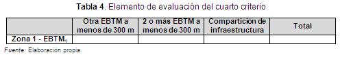 Para evaluar este criterio se asignó un valor de uno (1) a la estación base ubicada a una distancia menor de 300 m de otra EBTM, un valor de dos (2) si hay dos o más estaciones base a menos de 300 m de la estación evaluada, un valor de cuatro (4) para la EBTM que presente casos de compartición de infraestructura, y un valor de cero (0) a la estación base que no tienen a menos de 300 m otra estación o no comparten la infraestructura con otro operador; no obstante, el valor de cero (0) que se le asigna a este criterio, no significa que la estación base deje de representar una amenaza para la población que se encuentra próxima a la fuente radiante, pues su valoración se da por otras características (ver Tabla 4).