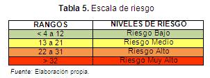 Finalmente, al evaluar cada una de las zonas donde se encuentran las EBTM según cada criterio y al obtener el resultado total de la suma de los valores de los criterios de cada área analizada (árean = 1er criterio + 2do criterio + 3er criterio + n criterio), se seleccionan las áreas de alto riesgo, teniendo en cuenta los resultados de la matriz. Para este caso, se estableció una escala de riesgo como se muestra en la Tabla 5.