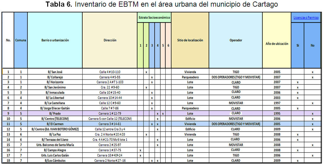 Según los resultados del inventario de EBTM, en el municipio de Cartago existen dieciocho (18) estaciones base, de las cuales nueve (9) son de Claro, cuatro (4) de Tigo, tres (3) de Movistar, y dos (2) de Tigo y Movistar (estaciones base compartidas). De las nueve que tiene Claro, siete (7) estaciones base cuentan con licencia para su instalación en el área urbana y dos (2) no tienen licencia; de cuatro (4) que posee Tigo, dos (2) tienen licencia y dos (2) no; mientras que, las tres (3) EBTM que tiene Movistar no poseen permiso de construcción; de la misma manera, que están ubicadas las dos (2) estaciones base que comparten Tigo y Movistar; arrojando lo anterior, un 50% de estaciones base que no cuentan con el permiso de instalación que es expedida por la Curaduría Urbana; lo que indica, que existe una carencia de un control físico por parte del Departamento de Planeación Municipal (ver Tabla 6).