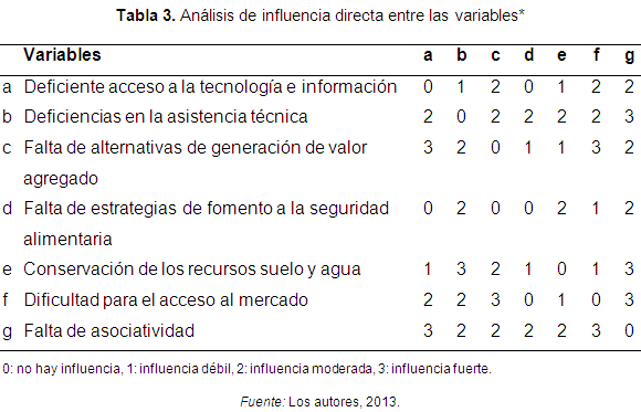 Teniendo en cuenta que algunas variables identificadas son aspectos externos al sector agropecuario que no son de injerencia de la Secretaría de Agricultura del municipio como las altas tasas de interés del sistema bancario y el mal estado de las vías y la inseguridad, que son competencia de los ministerios de Transporte y Defensa, respectivamente, no fueron abordadas para el diseño del Programa Agropecuario Municipal. En consecuencia, en esta etapa de la investigación, se tuvieron en cuenta las siguientes variables para realizar el análisis estructural prospectivo: falta de estrategias de fomento a la seguridad alimentaria, falta de alternativas de generación de valor agregado, deficiencias en la asistencia técnica, conservación de los recursos suelo y agua, falta de asociatividad y deficiente acceso a la tecnología e información. Aunque la relación directa entre variables tenía una escala de 1 a 4, los participantes no determinaron ninguna relación entre variables como "potencial" la cual estaba identificada con el número 4 (Tabla 3).