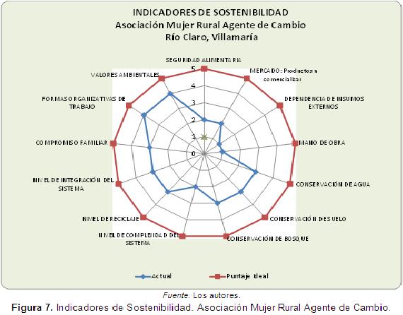 En la Asociación Rural Mujer Agente de Cambio, se obtuvo el menor nivel de valoración en la mayoría de los indicadores de sostenibilidad, situación que se hace comprensible dado que apenas se está iniciando el proceso de implementación de estrategias de producción más limpia.
