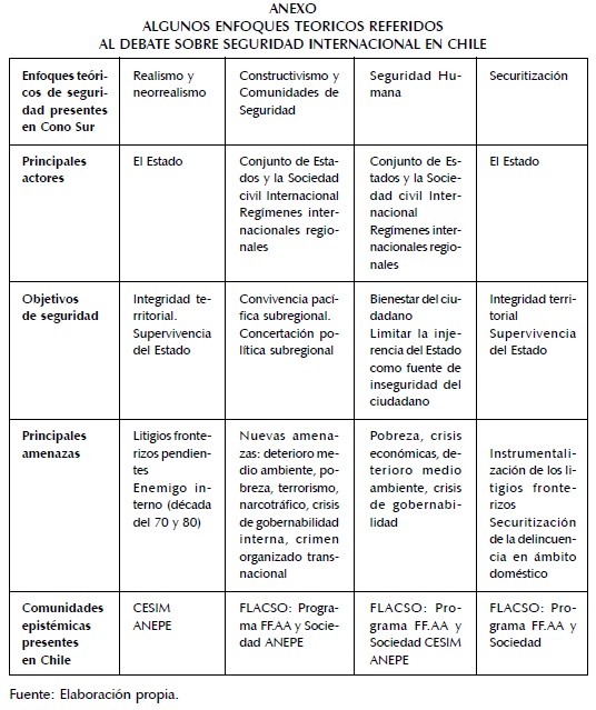 El giro en las aproximaciones de seguridad desde corrientes realistas hacia aproximaciones que promueven el cambio pacífico y que tienen como objetivo dimensiones referidas a la "comunidad internacional" e individuo en desmedro del Estado, se debería, entre otras razones, a la influencia de comunidades epistémicas (Adler y Haas, 2003; Peteres, 2003); estos enfoques abogaban por una mirada superadora del realismo, en el sentido de que este último enfatizaba sobre las aprehensiones de las fronteras contiguas y en un denominado enemigo interno, donde sobresalían amenazas sistemáticas a la seguridad (Atkins,1990). A partir de 1990, estos aspectos se hicieron obsoletos, aunque reinterpretados a la luz de nuevas amenazas a la seguridad, como es el caso de la ingobernabilidad, el narcotráfico, el terrorismo, la pobreza, el deterioro ambiental, etc. (Tickner, 2008; Griffiths, 2008), y por la persistencia de la percepción de amenazas en torno a rivalidades fronterizas o su instrumentalización (Fuentes, 2008; Leyton, 2005). En definitiva, estas variantes constructivistas apuntan a una relación más cooperativa en el ámbito de la seguridad presente en el Cono Sur, dando cuenta, además, de los cambios del sistema internacional en la pos Guerra Fría (Flennes, 2003; Fuch, 2006).