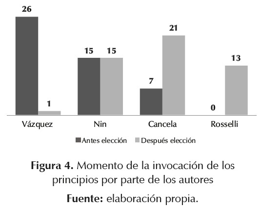 También es posible analizar en qué momento los autores emitieron sus mensajes e invocaron los distintos principios. Los datos de la figura 4 muestran una suerte de "división del trabajo", tomando como discriminante a la elección del país al Consejo. Antes de esta, el presidente Vázquez asumió la mayor carga comunicativa, con 26 invocaciones, realizadas principalmente durante su discurso en la Asamblea General. Pero tras la elección no se registran nuevas invocaciones, con la excepción del principio de cooperar manifestado durante una visita oficial a Chile. La escasa visibilidad que el presidente le ha dado al tema tras la elección refuerza entonces la hipótesis de que no es este un asunto que contribuya sustancialmente al gobierno, desde el punto de vista político-electoral, o de aprobación de su gestión e imagen.