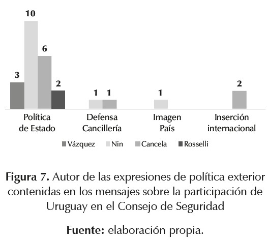 Otro aspecto relevante refiere a los autores de las expresiones dirigidas a la política doméstica. En este sentido, en la figura 7 se observa que los cuatro autores realizaron menciones respecto al concepto política de Estado, aunque con distinta frecuencia. Así, se destacan las menciones sobre el punto de Nin Novoa y, en menor medida, de Cancela, lo que va en línea con el objetivo del canciller desde el inicio de su gestión de ampliar la base de consenso de la política exterior uruguaya (Fernández Luzuriaga, 2015), para incluir a los partidos de oposición.7 Por otra parte, tanto Nin Novoa, como Cancela han reivindicado al Servicio Exterior, cada uno en una ocasión; por último, se registra que la mención a la imagen país pertenece al canciller, mientras que las dos menciones a la inserción internacional tuvieron como emisor al vicecanciller.