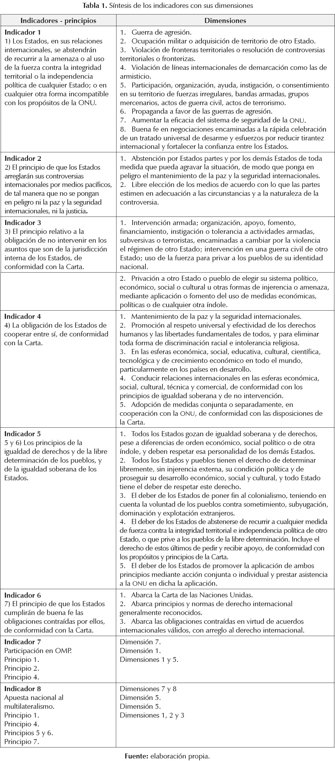 En concordancia con los cambios del periodo 1945-1960, inaugurando la Guerra Fría, y con la vigencia de una sección dogmática inédita en un documento de alcance universal -como la Carta de las Naciones Unidas-, la Resolución 2625 identifica siete principios fundamentales de derecho internacional que, si bien surgen de la Carta, encuentran en el texto una codificación detallada de alcances y corolarios. A los efectos de este trabajo, dos de esos principios serán fusionados: el principio sobre igualdad de derechos y de libre determinación de los pueblos y el principio relativo a la igualdad soberana de los Estados nacionales. Además, las reivindicaciones de un Estado nacional con el derecho internacional serán imputadas al principio sobre cumplimiento de buena fe de las obligaciones contraídas de conformidad con la Carta. Ambas decisiones serán fundamentadas en 2.5 y 2.6, respectivamente. Asimismo, se innovarán dos indicadores derivados del texto de la Resolución 2625. Un séptimo indicador supondrá una combinación de principios para clasificar los mensajes relativos a las OMP, instrumento producto de un desarrollo posterior a la Carta, y un octavo indicador responderá a otra combinación que abreva a las apuestas al multilateralismo, especialmente el del sistema de las Naciones Unidas.