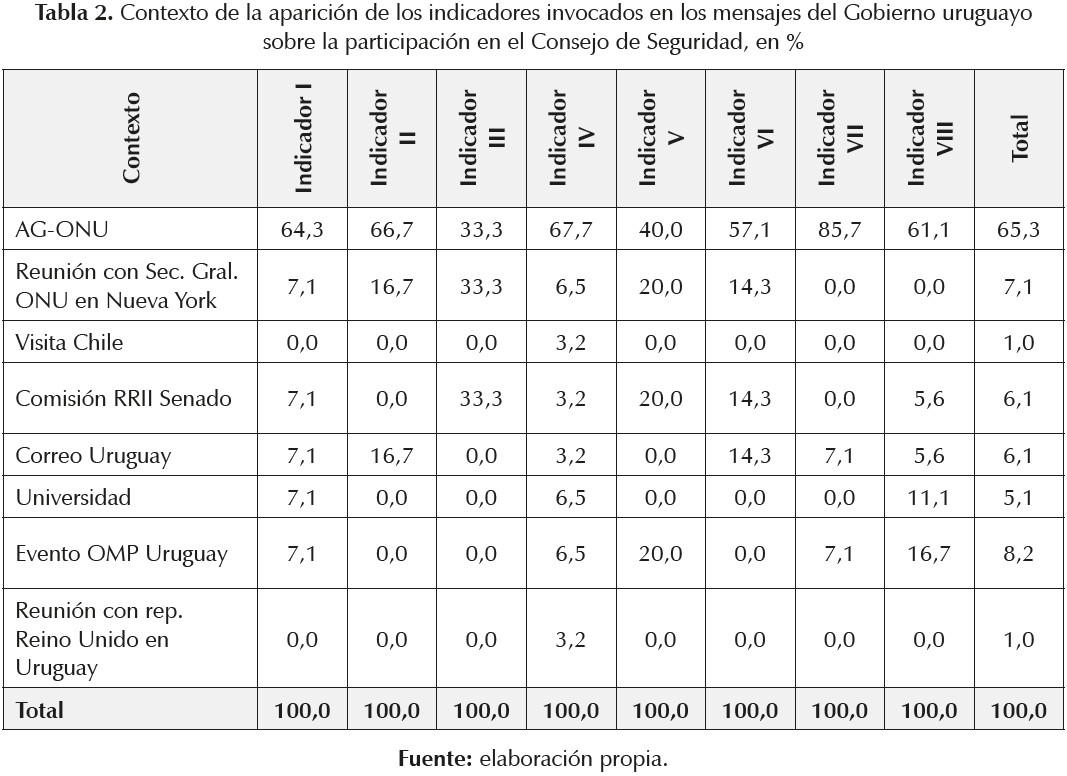 Finalmente, resta analizar el contexto donde aparecieron los indicadores. Esto permite visualizar si los énfasis fueron seleccionados de acuerdo con los distintos segmentos del público a los que se dirigían los mensajes, o si se mantuvo en cambio una única estrategia discursiva en los diferentes espacios de actuación. Los datos desplegados en la tabla 2 muestran que casi todos los indicadores encuentran en las actividades relacionadas con la Asamblea General de las Naciones Unidas el contexto de mayores menciones.