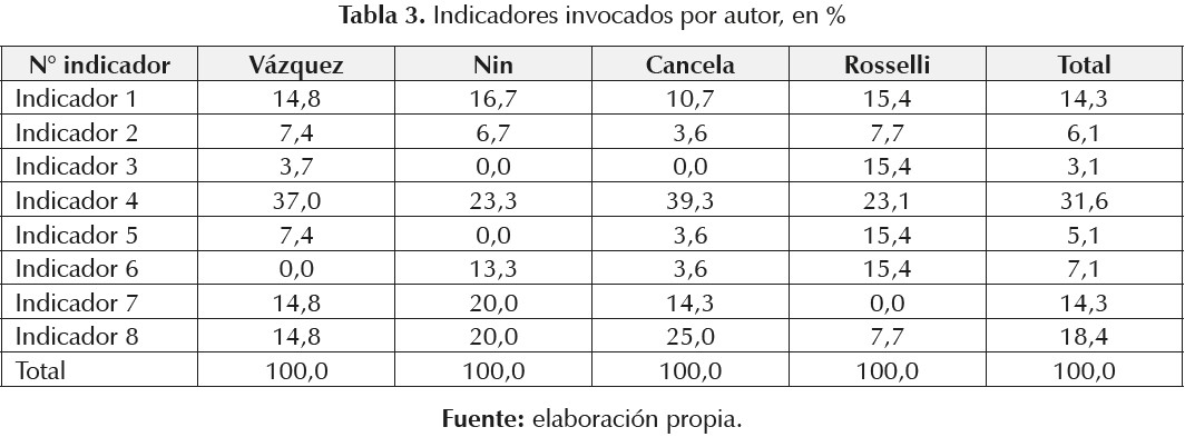 La primera observación que surge del análisis de los autores de los mensajes es su concentración en solamente cuatro funcionarios. En efecto, las alocuciones que recoge la Cancillería están monopolizadas por Vázquez, Nin Novoa, el subsecretario Cancela y el representante permanente, Elbio Rosselli. Al analizar por indicadores se encuentra que Nin Novoa es quien invoca más principios (30). Lo sigue Cancela con 28, luego aparece Vázquez con 27 y finalmente Rosselli con 13. ¿Qué principios invocaron los autores? ¿Es posible detectar diferencias entre ellos? Como se observa en la tabla 3, ningún autor se ajusta estrictamente a las proporciones del total. En cambio, cada uno presenta una propia distribución de frecuencias entre los diversos principios.