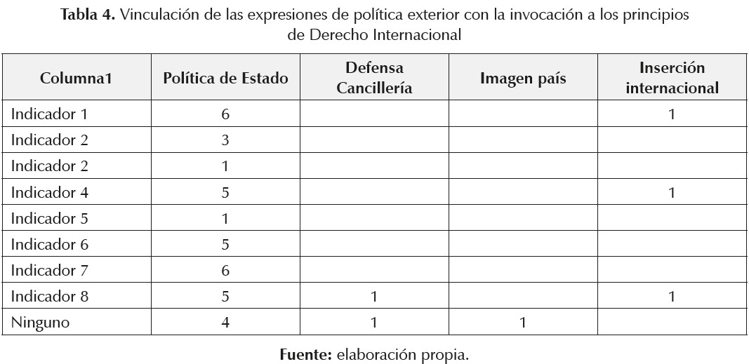 Finalmente, resta considerar el vínculo de las expresiones dirigidas al ámbito doméstico con los principios de derecho internacional invocados. La tabla 4 muestra que el concepto "política de Estado" fue mencionado en mensajes que a su vez contenían invocaciones a distintos principios o en mensajes que no contenían ningún principio. En seis ocasiones el concepto fue vinculado al principio de no recurrir a la amenaza o al uso de la fuerza y en otras seis, a las OMP, intentando trasmitir la idea de una amplia base de consenso sobre esta política. En cinco ocasiones se asoció al multilateralismo y en otras cinco, al deber de cooperar. En cuatro casos no se vinculó con ningún principio y en tres, con la solución pacífica de controversias, aspecto en el cual el país no maneja otras alternativas.