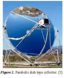 The parabolic dish-type collector has a hemispherical surface that reflects the radiation from the sun onto a reduced area located on the system’s focal point, where it is located on the receptor. Usually, it is used for temperatures between 130 and 600 °C; however, it depends on the device’s concentration ratio, defined as the relationship between the collector’s surface area “Sc” and the receptor area “Sr”. The higher the collector’s Sc/Sr ratio, the higher the temperature reached in the receptor. It is used for electric power generation and for devices requiring high temperatures like furnaces to incinerate hazardous wastes. The system is basically comprised of a collector, a heat exchanger (receptor), and a solar tracking system that aims the collector directly at the sun during the day.