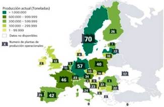 For 2014, Sweden, Germany, and Latvia were the principal biomass pellet producing countries in Europe. These three countries produce about 40% of the European total. Likewise, they have 24% of the total number of pellet production plants in the European Union and the United Kingdom, being Sweden, with 70 plants, the country with the highest number of plants installed (Figure 4).