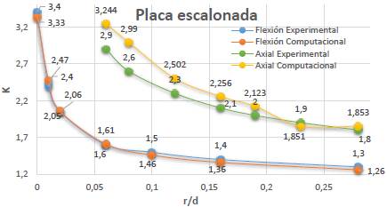 Furthermore, it is evident that the radius of agreement and the stress concentration factor have an inversely proportional relation, but said effect occurs faster in plates of this type subjected to flexing; the axial load requires higher radius increases to diminish in equal proportion the magnitude of K.
