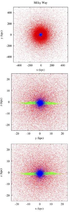 Figure 1 Initial structure of the Milky Way. Projections on the planes xy, yz and xz, respectively, are shown. The colors correspond to the different components of the Galaxy: blue for the bulge, green for the disk and red for the dark matter halo.