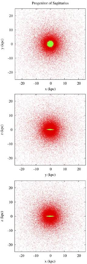 Figure 2 Initial structure of the Sagittarius dwarf. Projections on the planes xy, yz and xz, respectively, are shown. The colors correspond to the different components of the simulated galaxy: green for the disk and red for the dark matter halo.