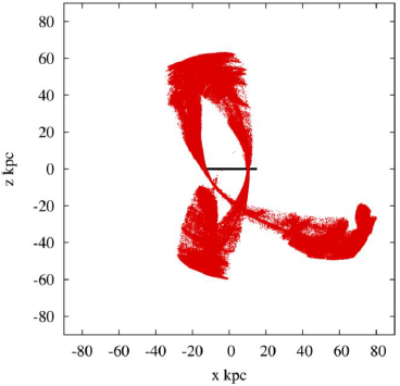 Figure 4 Tidal tails of the dwarf galaxy, projected on the xy plane, as it orbits the Milky Way. The horizontal line shows the position of the disk of the Milky Way. The red dots correspond to the disk particles of the progenitor of Sagittarius.