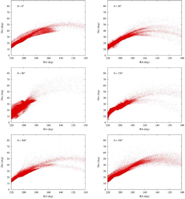 In addition, since for θ= 130° the bifurcation is more similar to the features observed by the SDSS DR5, we compute the physical properties of the remnant of Sagittarius in this simulation. When θ= 0° and θ= 90° no bifurcation is generated. Our results about the bifurcation for θ= 160° are similar with those obtained by [18] (θ = -20° in their paper).