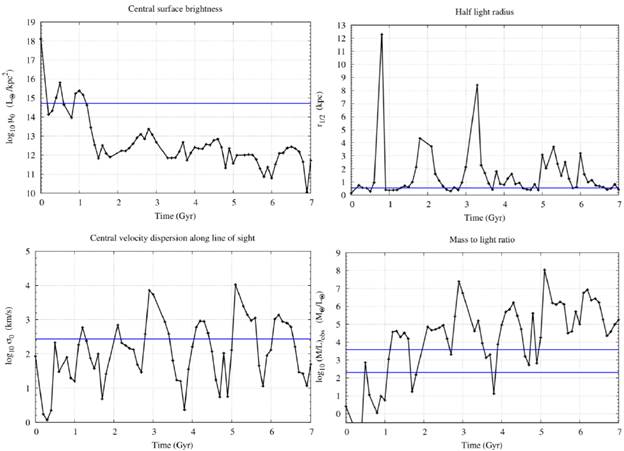 Figure 6 shows the time evolution during t = 7.0 Gyr of the central surface brightness, the half-light radius, the central velocity dispersion along the line of sight and the mass-to-light ratio for the progenitor of Sagittarius with an angle θ = 130°. These quantities were computed as described in [36].