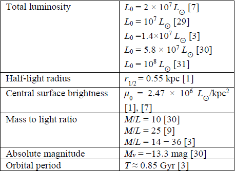 The physical properties of the remnant of Sagittarius to be determined are the central surface brightness, the mass-to-light ratio, the line-of-sight central velocity dispersion and the half-light radius.