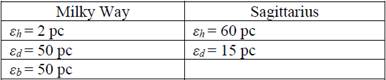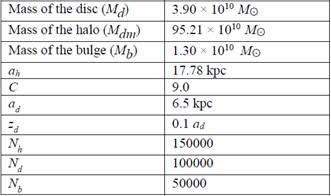 The GALIC program requires an input file with the values of the parameters of the galaxy to be created. The values used to create the Milky Way and Sagittarius with GALIC are listed in Tables 2 and 3 respectively.