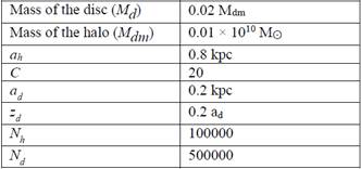 For the modeling of the Milky Way galaxy, the parameters are shown Table. Here a h is the radial scale length of the dark matter halo, C is the concentration parameter, ad is the radial scale length of the disk, z d is the vertical scale length of the disk, N h is the number of particles in the dark matter halo, N d is the number of particles in the disc and N b is the number of particles in the bulge. In Figure 1 the initial structure of the Milky Way, projected on the planes xy, yz, xz respectively, is shown.
