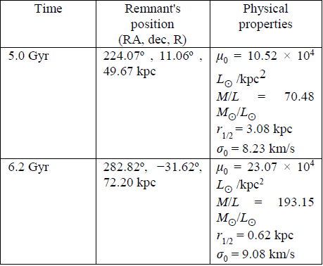 Table 7 shows that, as in the previous case, when the bifurcation appears (t = 5.0 Gyr) the remnant is not close to the actual position and the physical properties are not similar to those observed for this galaxy. Nevertheless, at t = 6.2 Gyr the position of this remnant is close to the observed position and quantities such as the half-light radius and the central velocity dispersion have values close to the current ones.