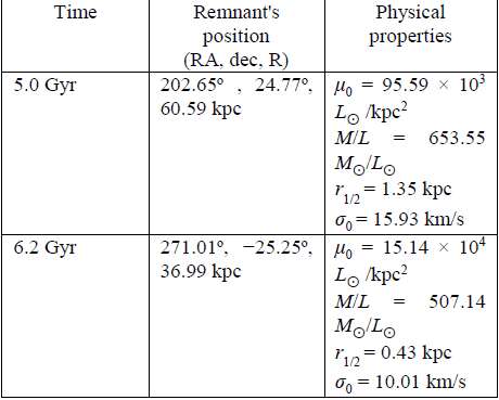 Table 6 shows the results obtained for the physical properties of the remnant of Sagittarius. Recall that the current position of Sagittarius is (RA, dec, R) = (238.7°, -30.5°, 24 kpc). For this simulation although the bifurcation is found it is not possible to locate the remnant in a position close to the present one.