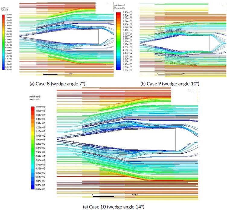 Como es posible observar en los resultados arrojados en las simulaciones de las líneas de corriente (ver Fig. 11), mientras más pequeño sea el ángulo de la cuña en la sección convergente, el flujo se adapta más fácilmente a la geometría de entrada; adicionalmente en la sección de descarga (zona divergente) existe menor separación del lujo al momento de ser entregada al ducto donde se producirá la combustión en el motor ramjet. Sin embargo, los resultados obtenidos con dichos ángulos de cuña pequeños (entre 7°- 10°) dieron a conocer que en la sección divergente, el lujo no se adaptaba completamente a la geometría en su parte superior. Finalmente, el caso 7 que presenta un ángulo de cuña de 14°, se puede observar que el lujo se adapta totalmente tanto en la sección convergente como en la divergente, razón por la cual se decide mantener dicha geometría como la base de estudios futuros del motor ramjet completo, ya que permite tener un buen comportamiento aerodinámico interno; adicionalmente como el área de entrada con dicho ángulo de cuña es mayor, se tendría un incremento lujo másico de aire que ingresa al motor, generando un mayor empuje.