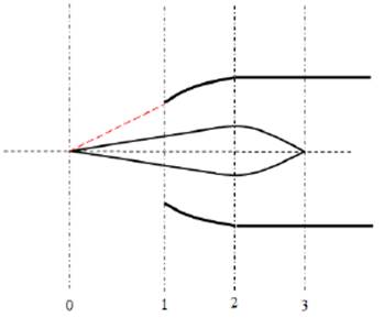 A partir de la aplicación de las ecuaciones de ondas de choque oblicuas (1 a 11) a las condiciones de operación del motor ramjet, se continuaron los cálculos de lujo isentropico a partir de las ecuaciones (12-15) en cada una de las secciones del difusor de entrada; dichas ecuaciones permitirán no solamente la determinación de las condiciones de operación en el difusor (ver Fig. 4) sino también conocer los parámetros geométricos en cada una de las secciones del mismo.