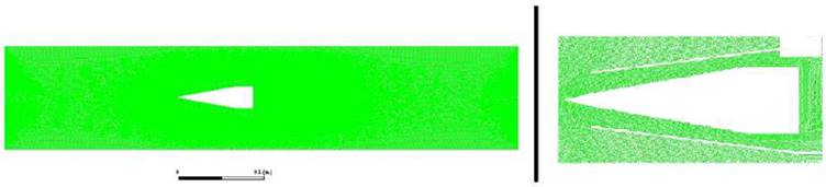 Finalmente, se procedió a generar la malla del volumen de control, en este caso las dos paredes nombradas symmetry deben tener exactamente el mismo enmallado. El proceso de creación de malla se inició a partir del enmallado de cada una de las líneas del volumen de control, generando mayor cantidad de nodos en las paredes del difusor de entrada del ramjet, con el fin controlar el tamaño de la celda en el eje x, y el tamaño de la capa límite (boundary layer) de la malla está dada a partir del cálculo del Y+[12,13]. Finalmente se enmalla la cara del volumen de control, garantizando que las zonas cercanas al difusor tengan mayor cantidad de nodos como es visible en las Figs. 6 y 7. Dicho enmallado responde a la correcta obtención de resultados del estudio de las ondas de choque generadas en la sección de entrada del motor. En el estudio de la influencia de la geometría del difusor de entrada de un motor ramjet en la propagación de ondas de choque por medio de software de dinámica de fluidos computacional se propusieron 70 diferentes geometrías de difusores de entrada, a partir del cambio de los ángulos de la cuña entre 7°-14° y el área en las secciones del difusor (ver Fig. 4).