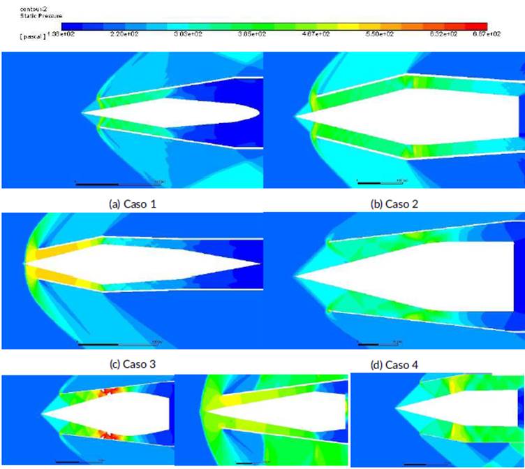Como se indicó anteriormente más de 70 simulaciones de geometrías del difusor de entrada del motor ramjet fueron llevadas a cabo. A continuación, y teniendo en cuenta las características geométricas expuestas en la Tabla 3, se presentarán los resultados de los casos más representativos, en los cuales se pudo observar la afectación de la geometría del difusor de entrada en la generación y propagación de ondas de choque a través del componente.