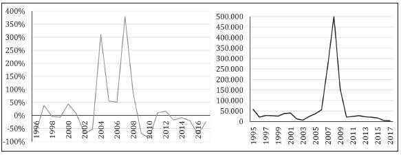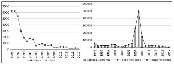 En cuanto a las importaciones colombianas del sector CCM procedentes de Venezuela, la gráfica 3 muestra que decrecieron de manera casi continua desde 1995. En efecto, hubo una reducción significativa entre 1995 y 2003, y luego una disminución continua, hasta llegar a representar apenas 146 mil dólares en 2017. Esta tendencia se constata durante más de 20 años, extendiéndose más allá del período de crisis económica venezolana. El bajo volumen de las importaciones hace entonces que la balanza comercial del sector CCM registrada por Colombia frente a Venezuela sea casi igual a las exportaciones, tal como lo muestra la gráfica 3.