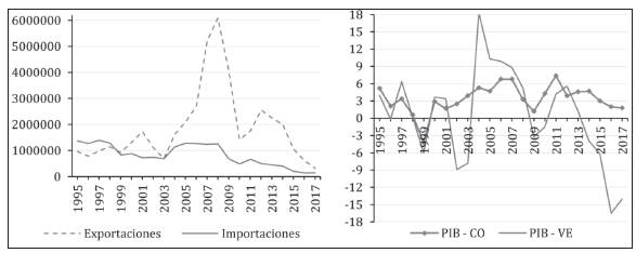 La evolución en los intercambios antes mencionada se atribuye a la inestabilidad que empezó a afectar la economía venezolana en 20087. Dicha inestabilidad se observa mediante la tasa de variación del PIB real (ver gráfica 1), la cual en 2009 vuele a ser negativa, siendo 2003 el último año en el que se presentó una tendencia similar. Luego de una breve recuperación entre 2010 y 2013, la tasa de variación del PIB volvió a caer y sigue siendo negativa hasta el día de hoy.