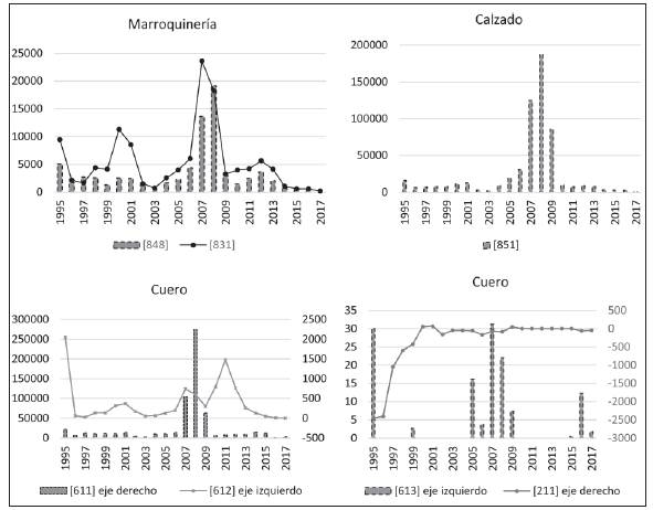 Solo en el caso de la categoría 211 «Cueros y pieles (Excepto pieles finas) sin curtir» se observa una balanza comercial negativa en los primeros años, antes de una reducción de este déficit, así que dicha balanza se mantiene alrededor de cero a partir de 2000.