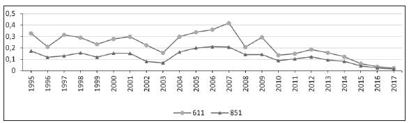 Gráfica 5 Indicador de ventajas comparativas reveladas, Colombia frente a Venezuela, Cuero (611) y Calzado (851), 1995-2017 (%0 PIB colombiano).