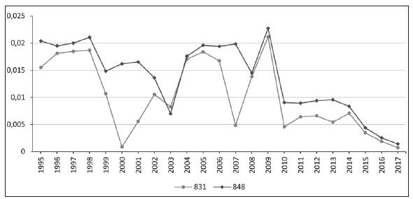 Gráfica 6 Indicador de ventajas comparativas reveladas, Colombia frente a Venezuela, categorías 831 y 848, 1995-2017 (%o, PIB colombiano).