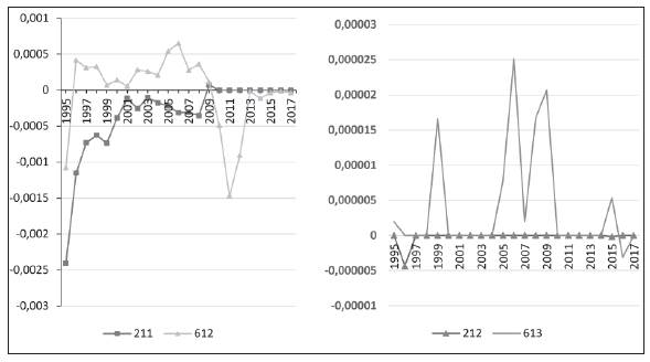 Igualmente, en la gráfica 7 se puede observar que una categoría de productos presenta un indicador VCR-CSC muy cerca de cero, positivo en algunos años y negativo en otros. Se trata de la categoría 612 «Manufacturas de cuero natural o sintético, n. e. p.; artículos de talabartería y guarnicionería». Por su parte, la categoría 211 «Cueros y pieles (Excepto pieles finas) sin curtir» presenta un indicador VCR-CSC igual a cero o negativo en algunos años, pero muy cercano de cero. Y para terminar, las categorías 212 «Pieles finas sin curtir» y 613 «Pieles finas curtidas o adobadas» presentan un indicador VCR-CSC igual o casi igual a cero.