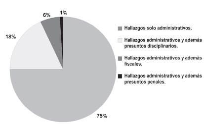 Es interesante advertir que los hallazgos con connotación fiscal son los segundos más bajos después de los presuntos penales. Los presuntos disciplinarios son los terceros en escala de menor a mayor incidencia, duplicando y hasta triplicando a los fiscales. Los hallazgos simplemente administrativos, que no derivaron en investigaciones de otro tipo, sino en planes de mejoramiento, son de lejos los más representativos.